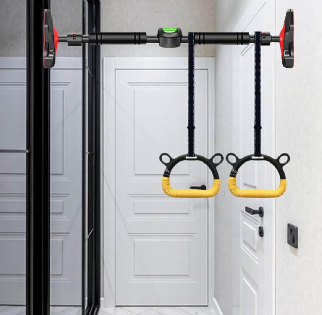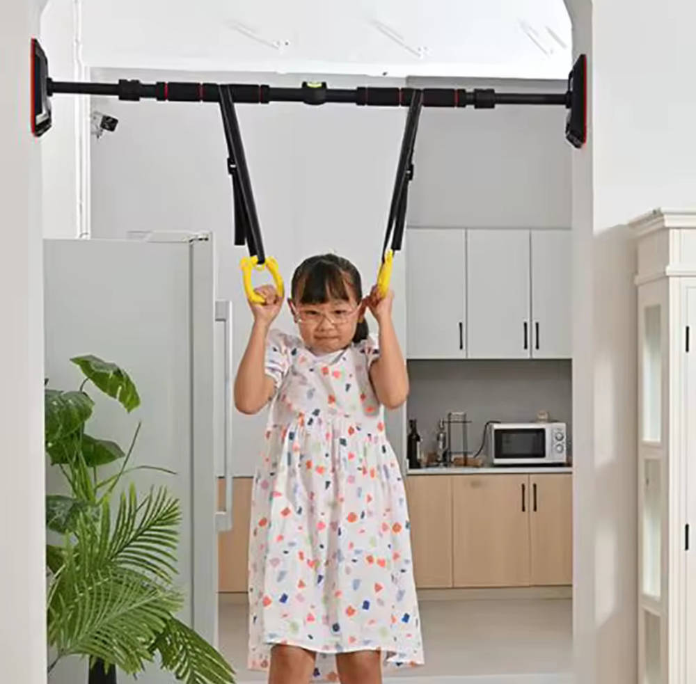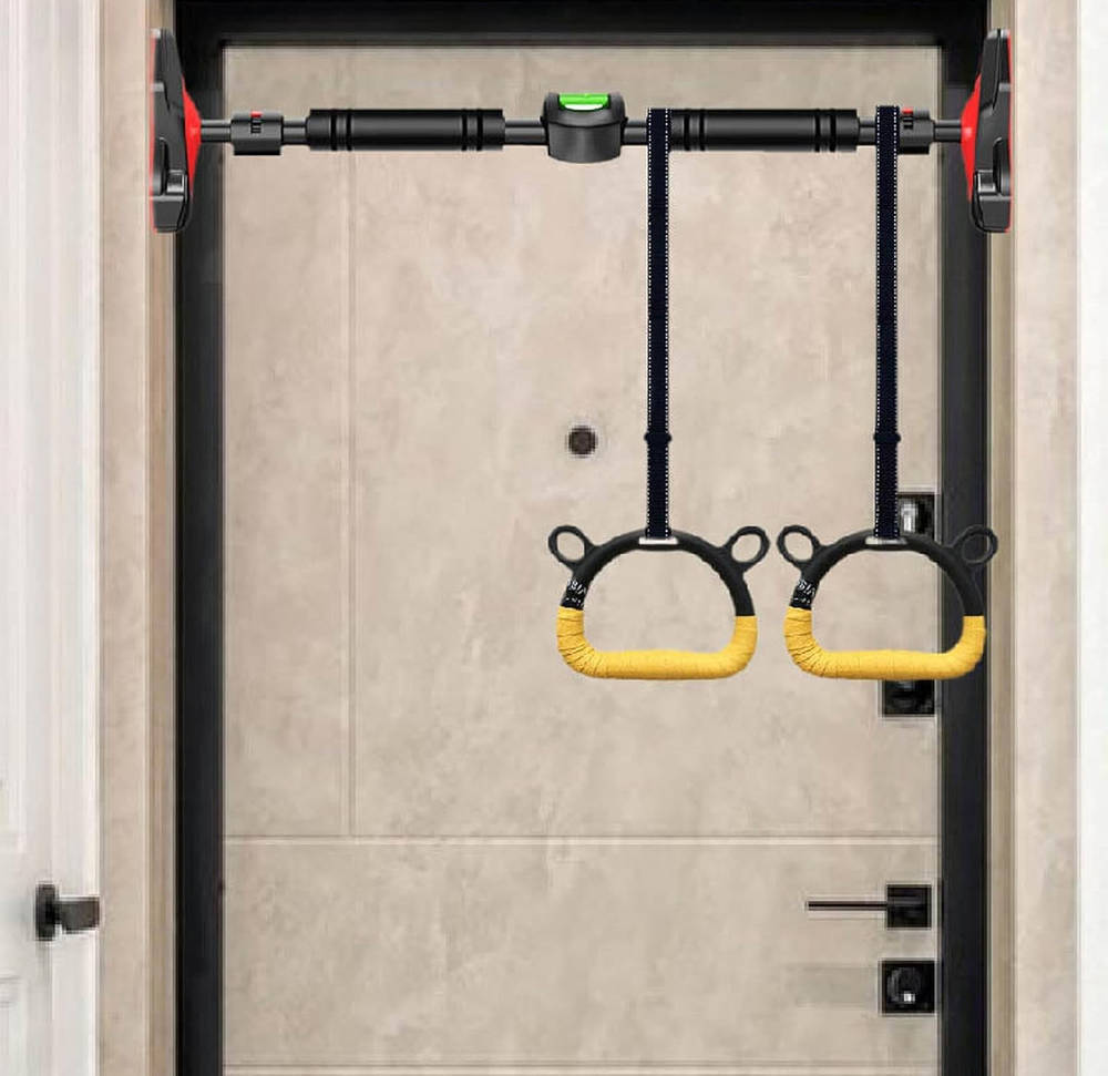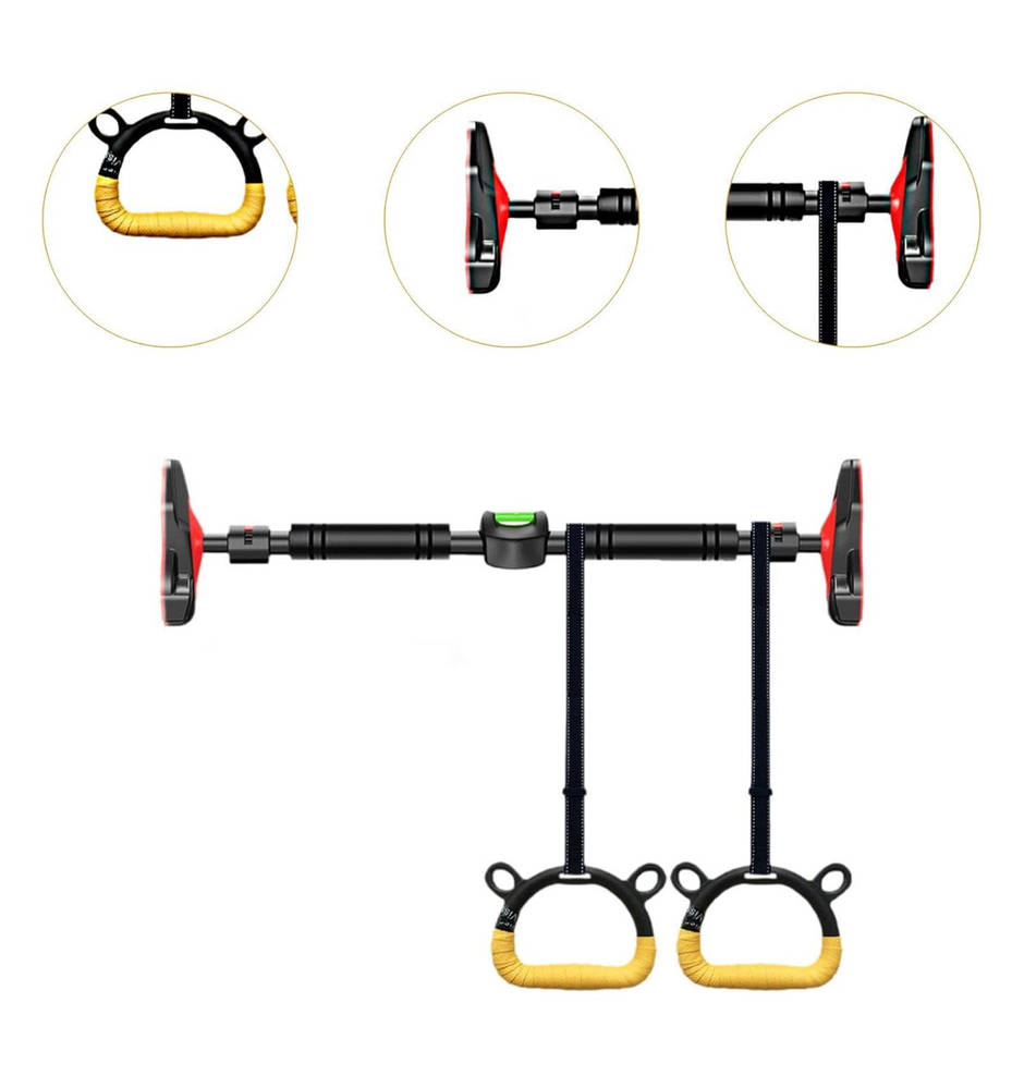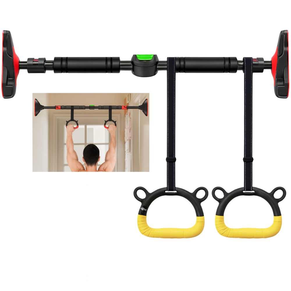 Універсальний розсувний турнік із додатковими кільцями для різноманітних вправ. Підходить для встановлення у дверний отвір або на стіну, допомагає розвивати м'язи спини, рук, грудей і преса